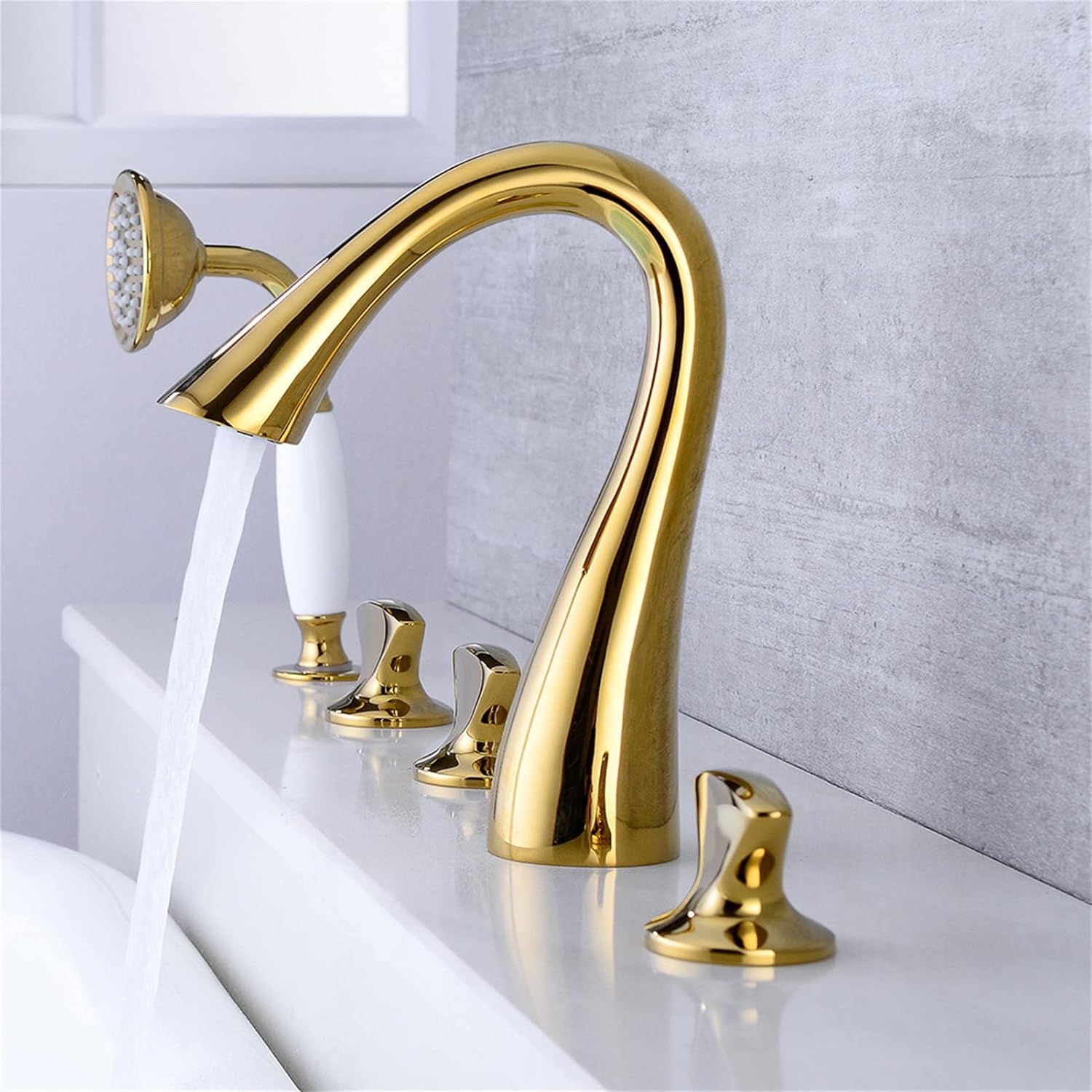 Add a touch of elegance and modern functionality to your bathroom with the Aquieen 5-Hole Brass Bath Mixer Faucet with Pull-Out Hand Shower, designed to deliver a luxurious bathing experience. Crafted from premium-grade brass, this deck-mounted 5-hole bathtub faucet ensures durability, corrosion resistance, and long-lasting performance. The triple handle system allows for smooth and precise control of hot and cold water, giving you a comfortable and customizable bathing experience.