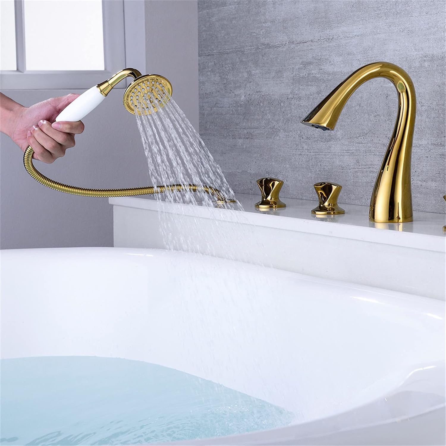 The gold finish, applied using advanced electro coating technology, enhances the faucet’s resistance to scratches, tarnish, and wear, ensuring a brilliant shine that lasts over time. The included pull-out hand shower with a 1.5-meter flexible hose adds versatility and convenience, making rinsing and cleaning easy and efficient. The smooth-flow water spout prevents splashing, delivering a seamless and enjoyable bath experience.