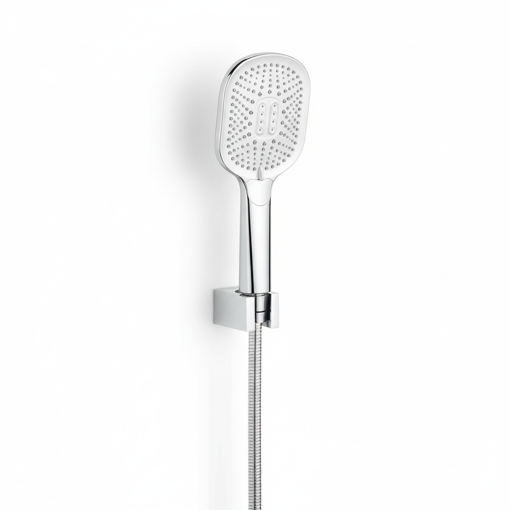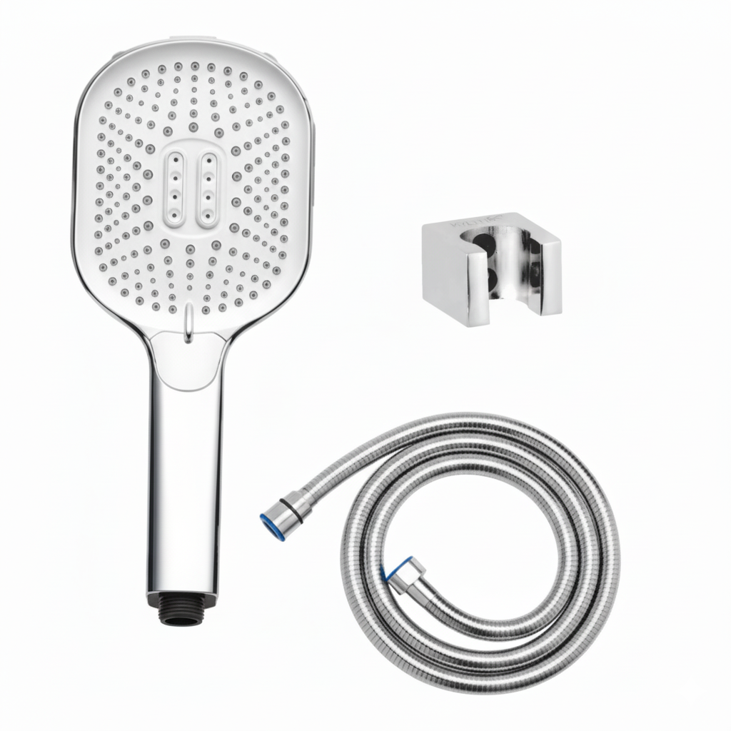 • COMPLETE SHOWER SET WITH FLEXIBLE STAINLESS STEEL HOSE ➜ Comes with a 1.5-meter stainless steel hose and a sturdy wall hook, offering convenient, space-saving installation.