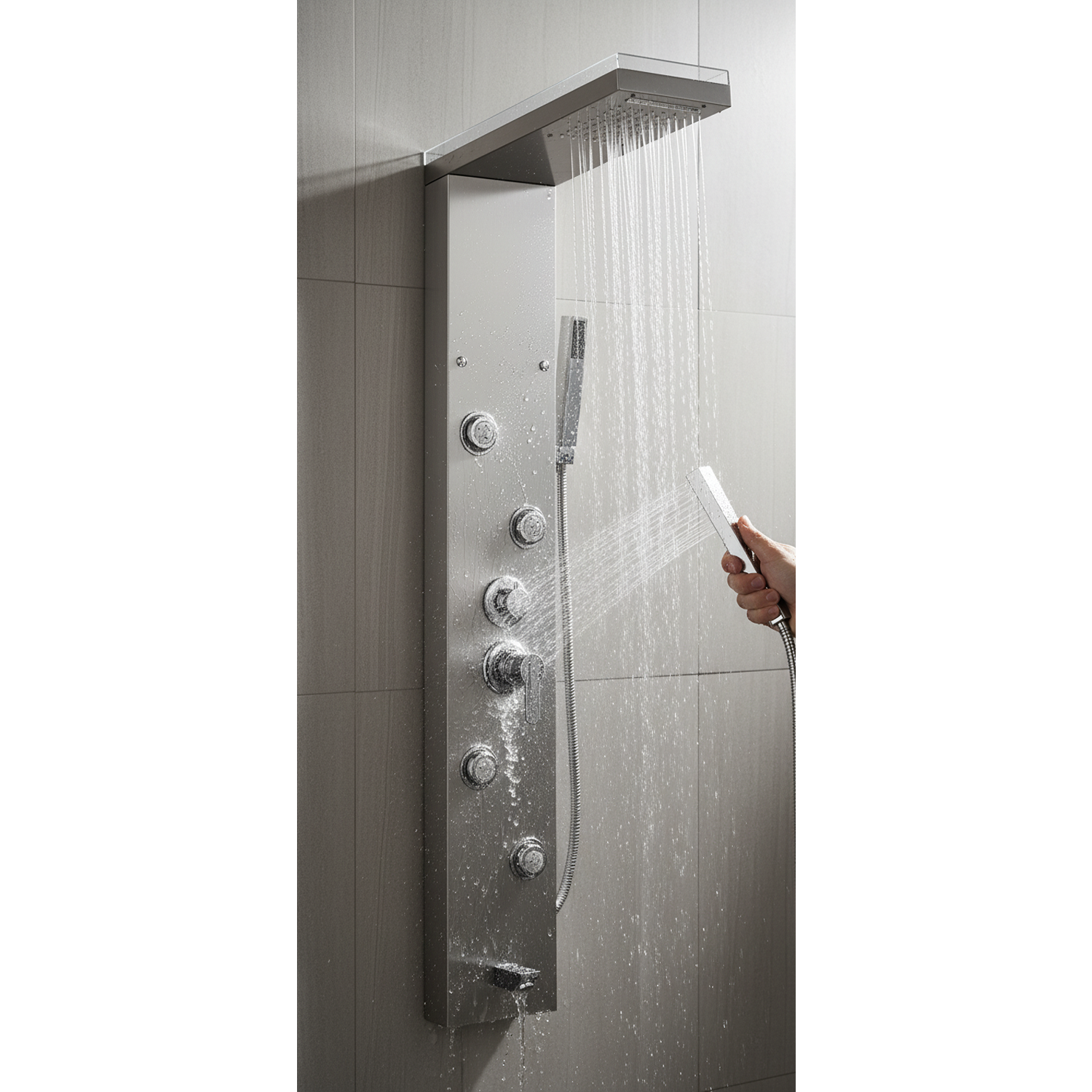 - 5-IN-1 SHOWER PANEL SYSTEM ➜ Features Rainfall, Waterfall, Handheld Shower, Body Jet Sprays, and a Tap Spout for a complete and customizable bathing experience.